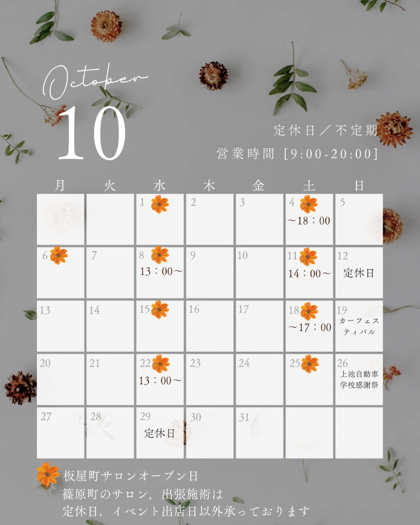 10月の営業日とイベントの出展予定となります。